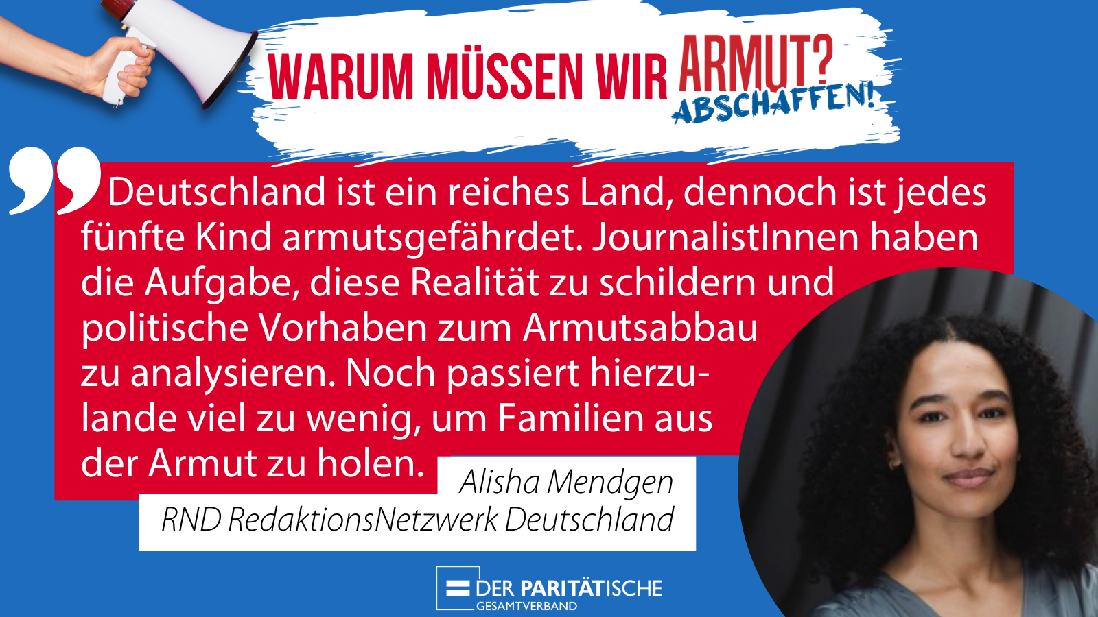 Armut? Abschaffen! Zum zweiten Mal veranstaltet der Paritätische Gesamtverband einen digitalen Aktionskongress gegen Armut. Worum geht es? Gemeinsam lernen, vernetzen und handeln, um armutspolitischen Forderungen mehr Gehör in der Öffentlichkeit und Politik zu verschaffen und den Druck für Veränderung erhöhen. Mit dabei sind spannende Impulsgeber*innen - Einige stellen wir in diesem Beitrag vor.