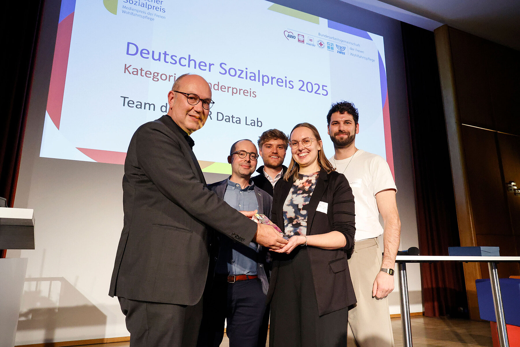 Die letzte Kategorie war ein echtes Gemeinschaftsprojekt. Ganze 17 Personen waren an der umfassenden Datendokumentation "Herzstillstand kann jeden treffen" beteiligt. Nun musste Laudator Rüdiger Schuch von der Diakonie keine 17 Sozialpreise vergeben, aber immerhin vier Journalist*innen waren anwesend und berichteten von dem umfangreichen und innovativen Projekt, für das sie seit 2017 umfangreiche Daten zur Versorgungslage im Falle eines Herzstillstandes gemacht haben. Auf der daraus entstandenen Homepage kann jede*r schauen, wie gut oder vielleicht auch schlecht er bei Herzproblemen versorgt wird. Diese aufwändige Arbeit war der Jury einen Sonderpreis wert.